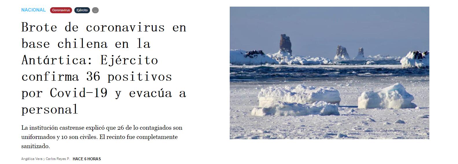 智利陸軍發表聲明解釋說,感染人員在出現症狀之後已撤離,然後接受核酸檢測。聲明解釋說:「36人檢測結果呈陽性,其中26人是陸軍人員,還有10人是承包商公司的員工,該公司正在南極基地進行定期維護工作。」