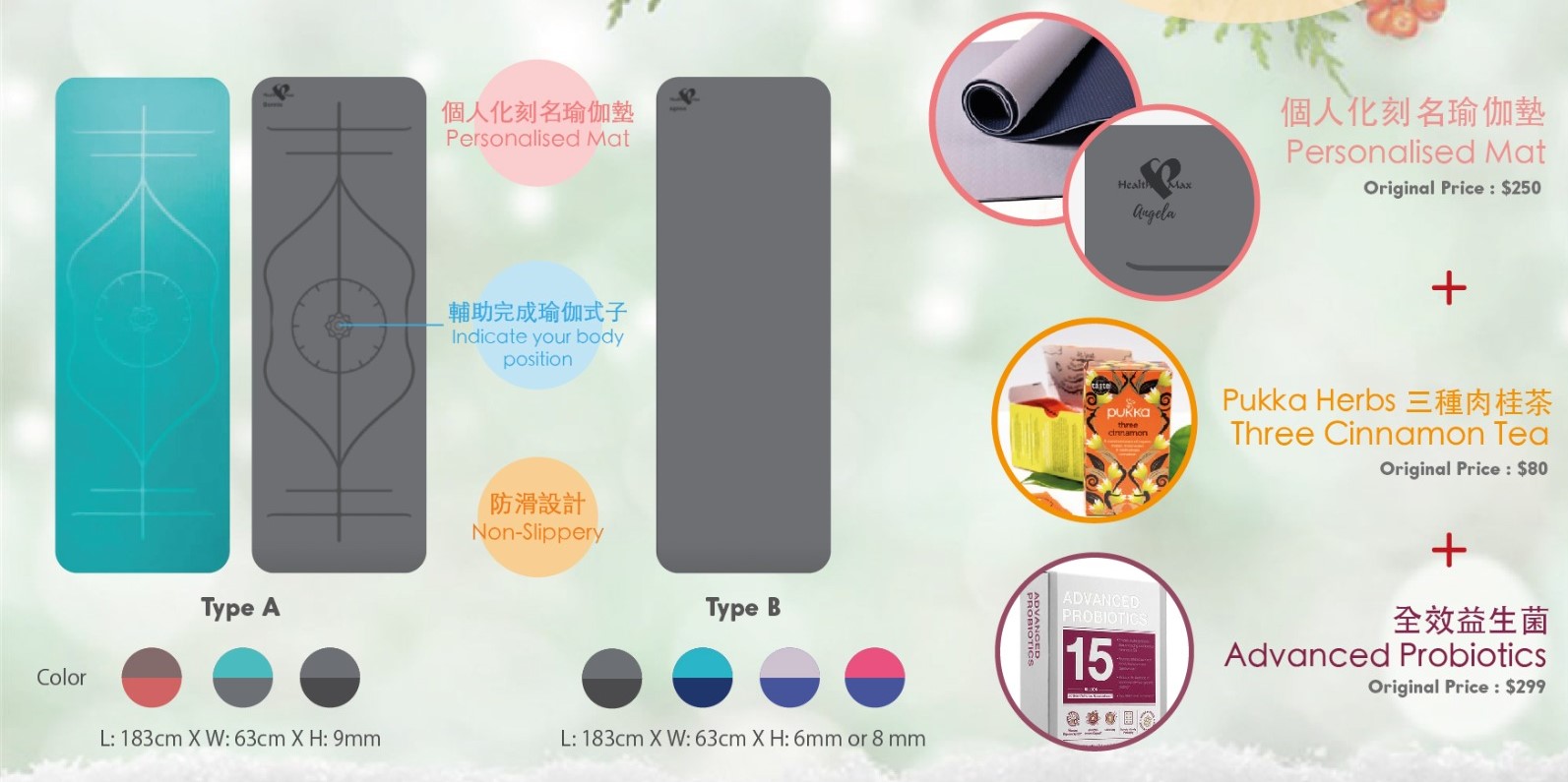 套裝包括個人化刻名瑜伽墊1張、Pukka Herbs玉桂茶1盒、全效益生菌及益生元1盒,售港幣380元。