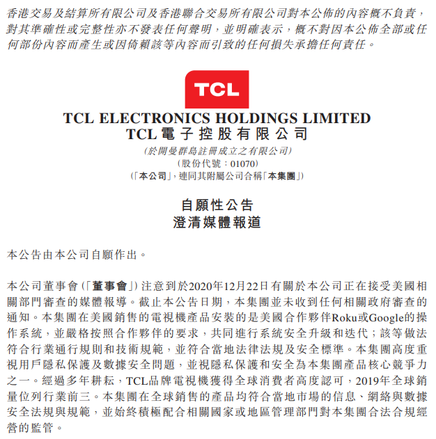 TCL電子指出,集團在美國銷售的電視機產品,安裝的是美國合作夥伴Roku或Google的操作系統,並嚴格按照合作夥伴的要求,共同進行系統安全升級和迭代,做法符合行業通行規則和技術規範,並符合當地法律法規及安全標準。