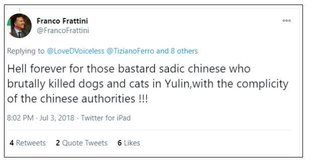 據悉,該名法官是意大利的前外交部長。孫楊的律師發現,他曾多次在抨擊中國的玉林吃狗肉的情況時,發表過種族主義言論。比如他在2018年8月時曾發帖稱「那些殺狗的野蠻殘忍的中國人都應該永遠下地獄」,還曾在2019年6月2日稱一名疑似在虐狗的中國男子為「殘忍的黃皮膚」,並稱西方國家在與中國打交道時應該記住中國這一殘忍的形象。