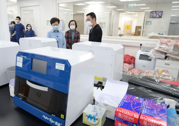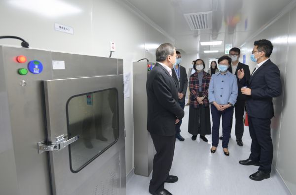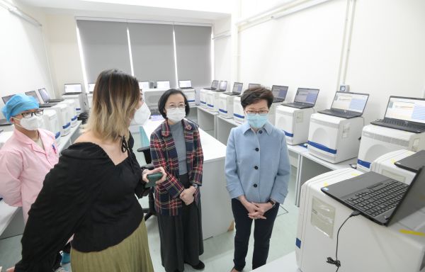 繼上星期在政府總部與有關承辦商見面交換意見後,行政長官林鄭月娥25日在食物及衛生局局長陳肇始陪同下,先後到訪5所檢測承辦商位於不同地區的化驗所,了解檢測工作的工序和流程、儀器和人手、每日檢測量和其他營運情況,並向當值員工送上節日祝福。