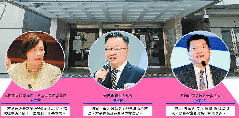 近年來,本港法庭屢屢作出爭議判決,稍早前高等法院同意黎智英保釋更引起各方嘩然。本報近日採訪多位法律界重磅人士,包括經民聯立法會議員、基本法委員會委員梁美芬、港區全國人大代表陳曉峰、香港法學交流基金會主席馬恩國,他們均認為法律界人士應加深了解「一國兩制」和基本法,還須學習基本法的「根」——國家憲法。