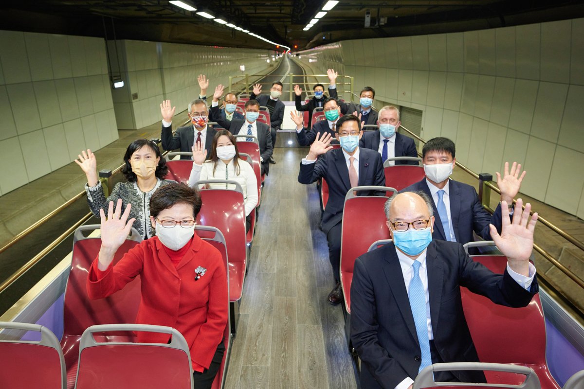 林鄭月娥與多位特區政府官員共乘敞篷巴士前往屯門。政府新聞處