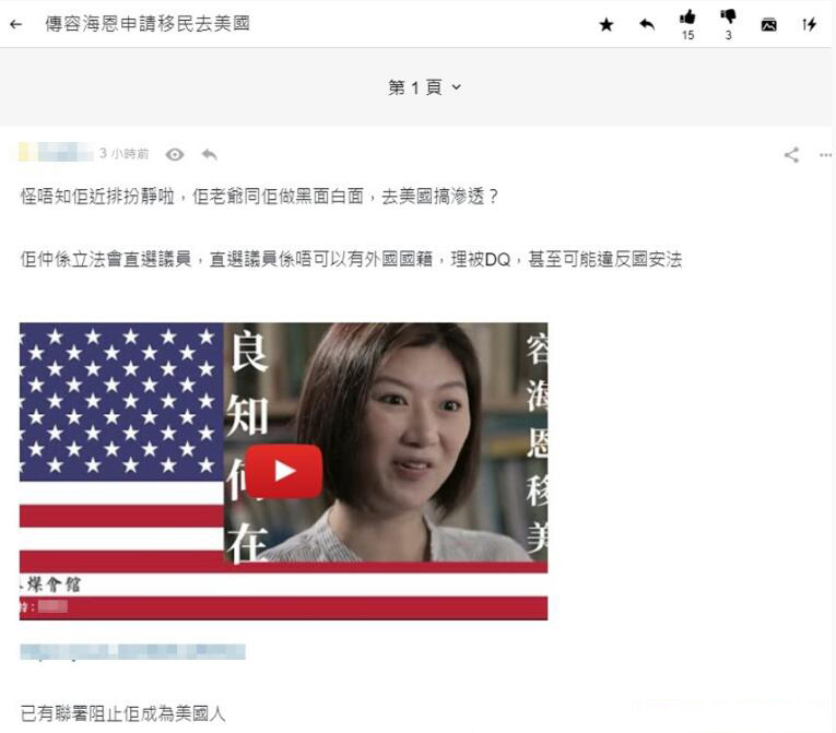 近日網上流傳新民黨立法會議員容海恩正申請移民到美國,甚至有人發起白宮聯署,要求美國阻止她成為美國人,指容海恩有份支持香港國安法、《逃犯條例》修訂。容海恩今日(26日)對此澄清,指自己沒有申請移民美國,從來只手持一本護照,未來亦沒有移民計劃。
