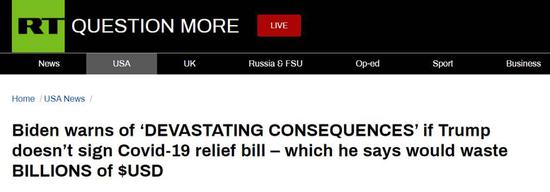 據「今日俄羅斯」(RT) 報道,美國當選總統拜登當地時間26日警告特朗普稱,如果後者不簽署新冠紓困法案,將會带來「毀滅性的後果」。報道提到,特朗普曾說該法案將浪費數十億美元。