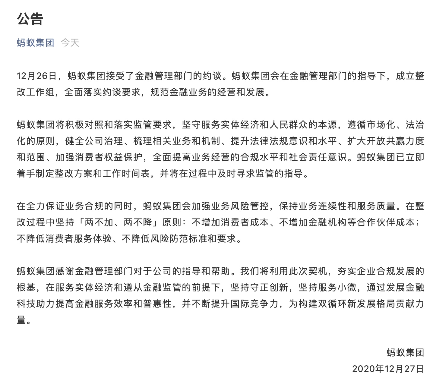 公告稱,螞蟻集團將積極對照和落實監管要求,堅守服務實體經濟和人民群眾的本源,遵循市場化、法治化的原則,健全公司治理、梳理相關業務和機制、提升法律法規意識和水平、擴大開放共贏力度和範圍、加強消費者權益保護,全面提高業務經營的合規水平和社會責任意識。螞蟻集團已立即著手制定整改方案和工作時間表,並將在過程中及時尋求監管的指導。