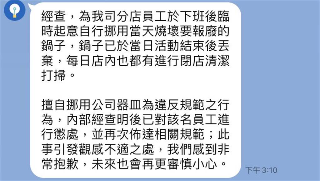 對此,春水堂總公司也做出聲明,確認照片為某分店員工下班後臨時起意的動作,並解釋員工自行挪用當天燒壞要報廢的鍋子,鍋子已於當日活動結束後丟棄,每日店內也都有進行閉店清潔打掃。