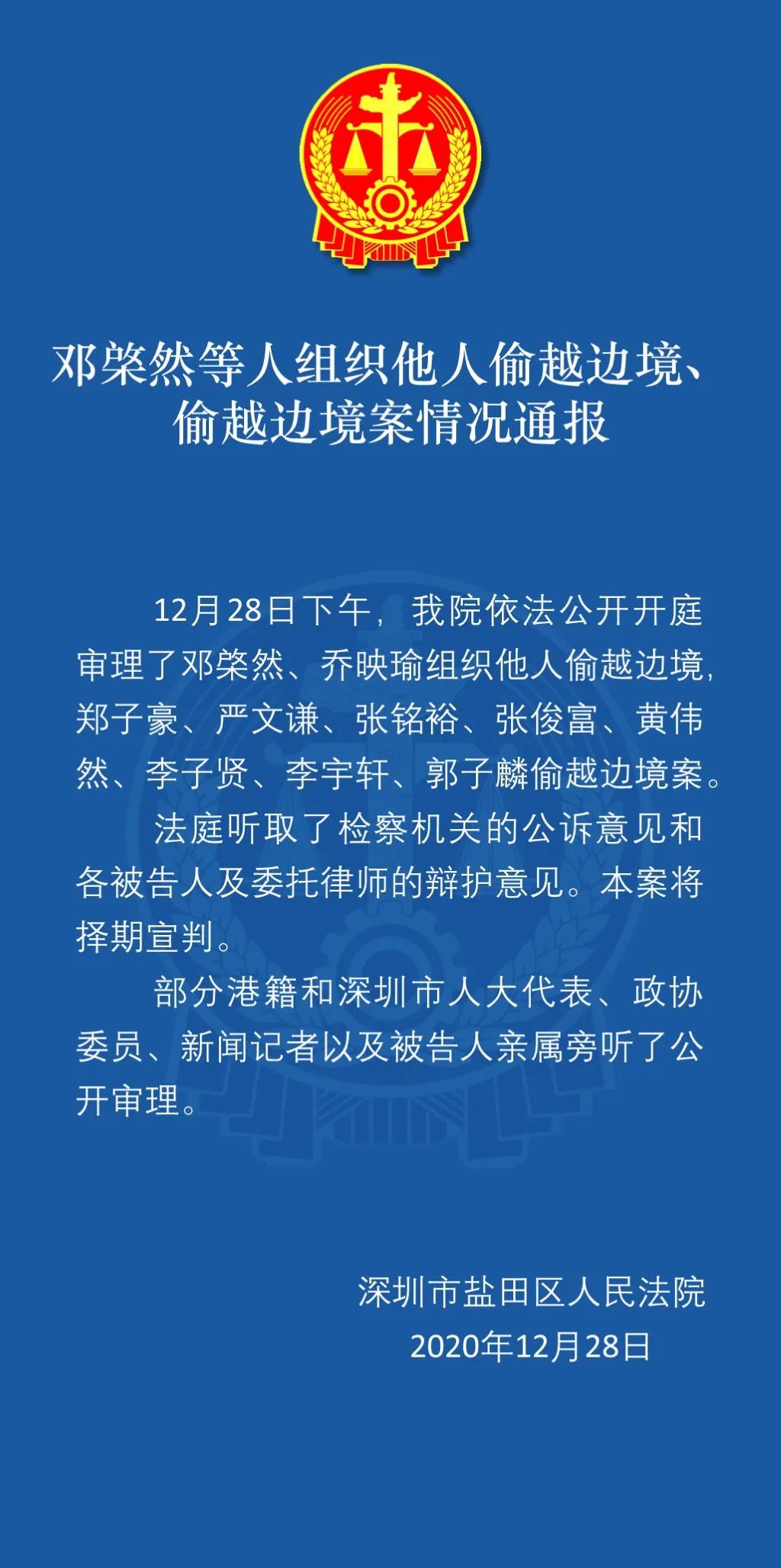 公告稱,深圳市鹽田區人民法院依法公開開庭審理了鄧棨然、喬映瑜組織他人偷越邊境,鄭子豪、嚴文謙、張銘裕、張俊富、黃偉然、李子賢、李宇軒、郭子麟偷越邊境案。