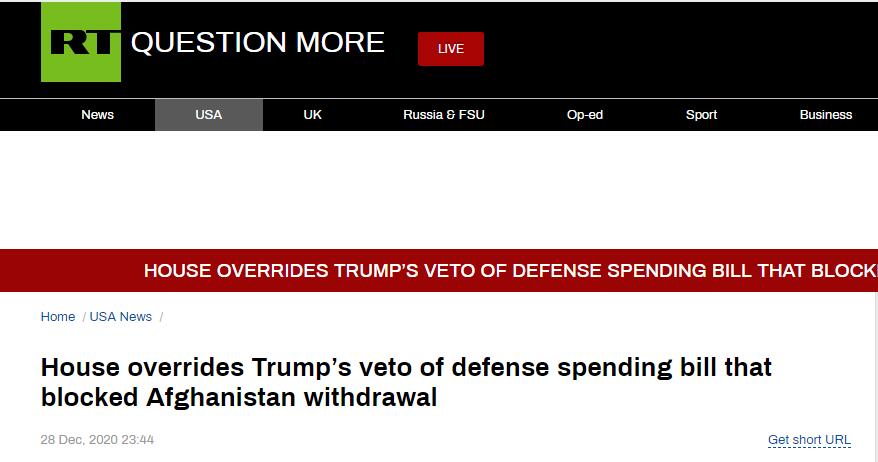 據「今日俄羅斯」(RT)剛剛消息,美國國會眾議院投票駁回了總統特朗普對總額約7400億美元國防授權法案的否決。
