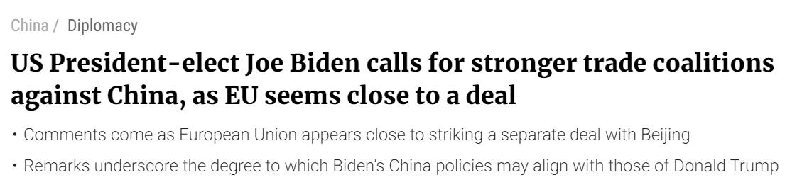 此前,據彭博社報道,拜登的國安顧問蘇利文本21日晚間在推特發文,他在引述了一篇有關擬議的中歐投資協定報道後,呼籲「就美國與歐洲盟友對中國經濟做法的共同關切,儘早與歐洲夥伴進行磋商」。