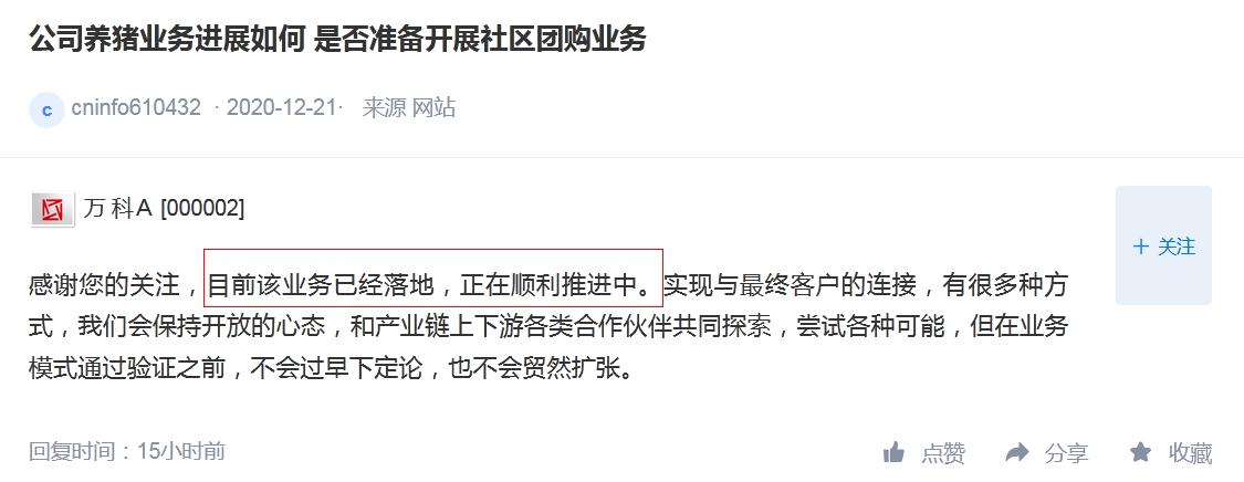 近日有投資者在深交所互動易平台向萬科A提問:公司養豬業務進展如何,是否準備開展社區團購業務?對此,萬科A回應,目前養豬業務已落地,正順利推進中。萬科A還稱,會保持開放心態,和產業鏈上下游各類合作夥伴共同探索,嘗試各種可能,但在業務模式通過驗證之前,不會過早下定論,也不會貿然擴張。