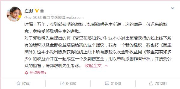 今日上午,作家莊羽通過微博回應郭敬明的道歉表示,時隔十五年,收到郭敬明的道歉,如郭敬明先生所說,這的確是一份遲來的歉意,我接受郭敬明先生的道歉。
