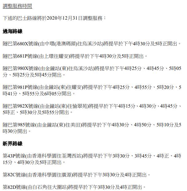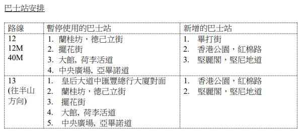 至於巴士服務,部分城巴及新巴路線會在中環實行巴士站及改道臨時安排;另有部分巴士線調整服務時間和改道。