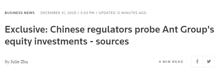 據路透引述三名知情消息人士透露,中國監管機構正在排查螞蟻集團對數十家企業的股權投資情況。
