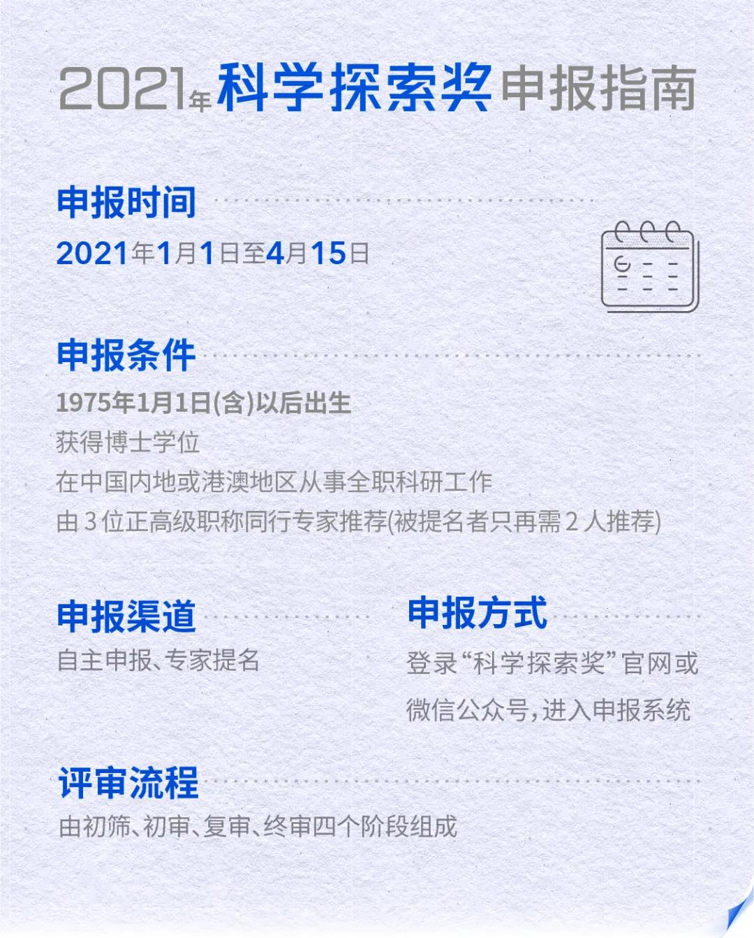 年齡不超過45周歲,取得博士學位,且全職在中國內地及港澳地區工作的青年科技工作者都可以按照相關指引,通過「科學探索獎」官方網站(http://www.xplorerprize.org)進行申報。申報截止日為2021年4月15日,之後將由評審委員會獨立開展評審,獲獎名單預計在2021年9月揭曉。