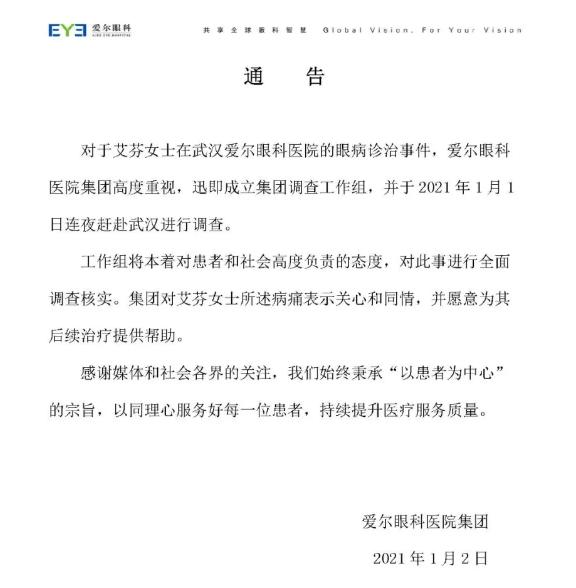 2021年1月2日,愛爾眼科微信公眾號發布通告稱,對於艾芬女士在武漢愛爾眼科醫院的眼病診治事件,愛爾眼科醫院集團高度重視,迅即成立集團調查工作組,並於2021年1月1日連夜趕赴武漢進行調查。工作組將本著對患者和社會高度負責的態度,對此事進行全面調查核實。集團對艾芬女士所述病痛表示關心和同情,並願意為其後續治療提供幫助。