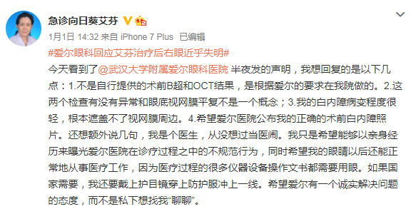 2020年12月31日,一篇名為《武漢某醫院急診科主任艾芬在愛爾眼科治眼 致右眼視網膜脫離近乎失明》的文章在網絡上傳開。