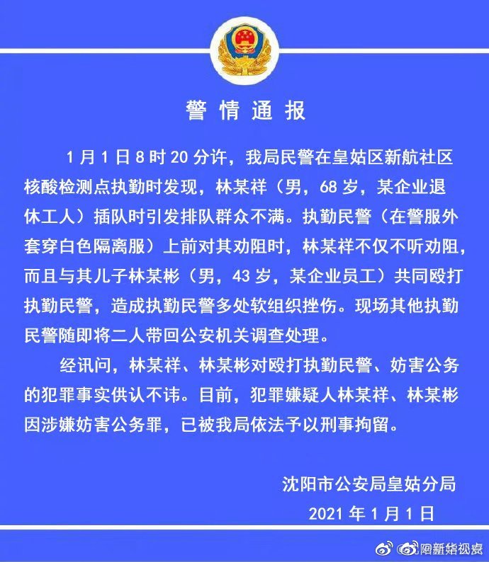 一段「身穿防護服的人遭到毆打」的視頻1日引發關注。瀋陽市公安局皇姑分局回應稱,皇姑分局執勤民警(在警服外套穿白色隔離服)在社區核酸檢測點執勤時發現,林某祥插隊時引發排隊群眾不滿,上前勸阻時,林某祥與其兒子林某彬共同毆打執勤民警。目前,打人者已被刑事拘留。