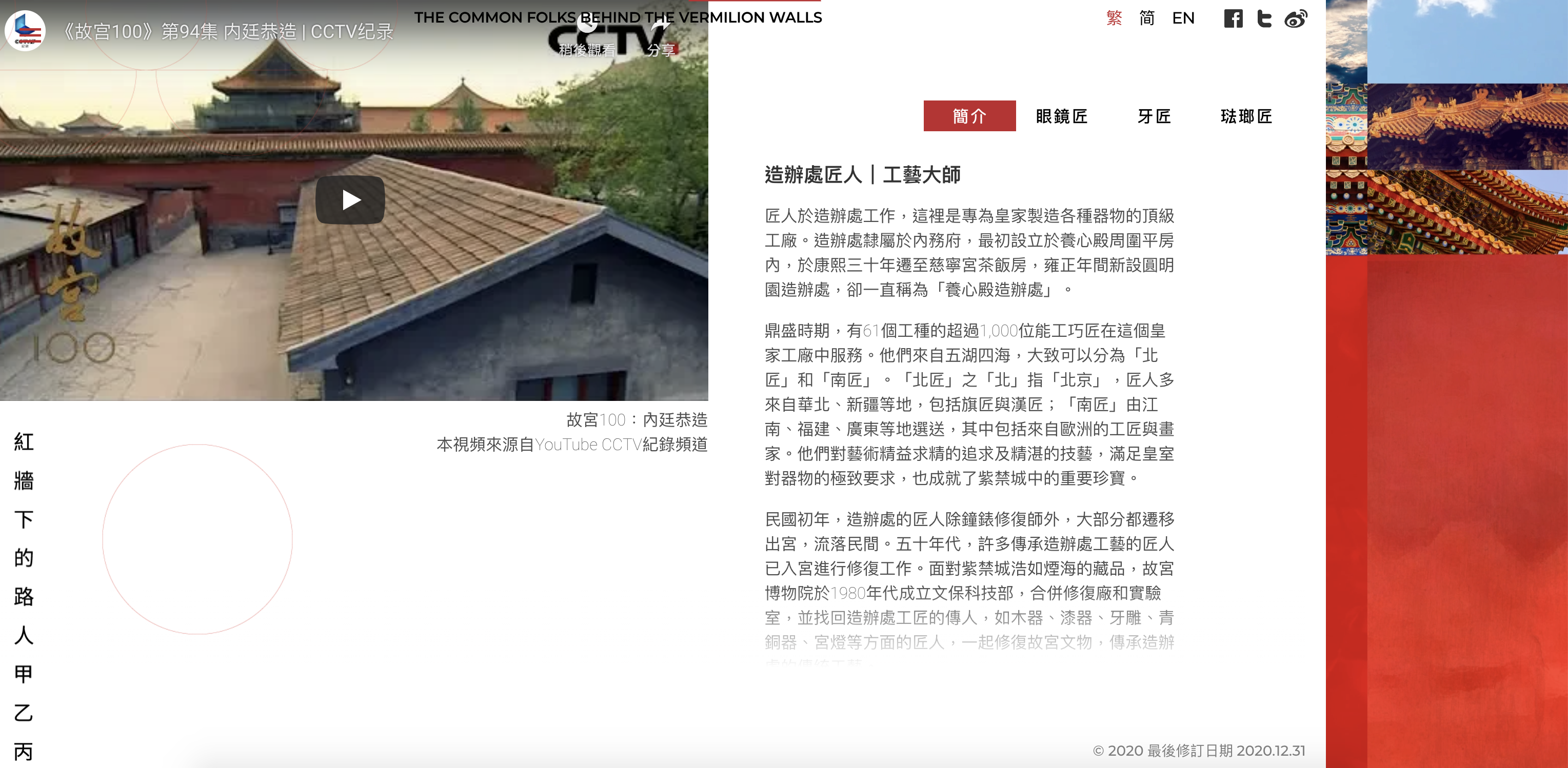 有着六百年歷史的紫禁城,相信讀者對於城內皇家的盛世繁華,爭奇鬥豔的故事都相當熟悉,然而,紅牆下名不見經傳的小人物,如何發揮他們獨當一面的技術和智慧,同時又過着什麼生活?康文署與故宮博物院合辦「穿越紫禁城」系列,繼2019年舉辦展覽「穿越紫禁城-建築營造」後,最近再合辦線上展覽「紅牆下的路人甲乙丙」,以文字、影片及圖片介紹宮中小人物,如五星級的禦廚、妙手回春的太醫、手藝精湛的匠人等人物,通過揭示他們的職責及技藝,從平凡人角度了解宮中生活。