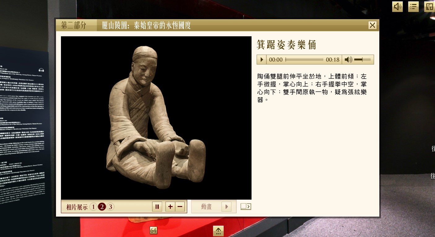 2012年康文署和陝西省文物局於香港歷史博物館合辦的「一統天下:秦始皇帝的永恆國度」,呈獻120件珍貴出土文物,包括20個造型獨特的秦俑,及多件難得一見的彩繪文物。當中四成屬國家一級文物,而且當時展覽突破了國家文物及兵馬俑出境的數量限制。展覽分為3區,分別「一統天下:從嬴秦到秦帝國」、「麗山陵園:秦始皇帝的永恆國度」及「永續留存:秦文化大遺址保護」。在線上展覽中,可回顧「秦公鎛」、「小金盆」、「彩繪陶雙耳壺」、「咸陽宮車馬圖壁畫」、「彩繪騎馬俑」、「彩繪跪射俑」、「立射俑」、「箕踞姿奏樂俑」等必看展品。