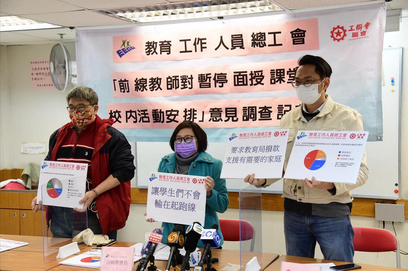工聯會下屬教育工作人員總工會一調查顯示,疫情下教師工作壓力和工作時數大增,教學效能大減,而學生學習成效亦大減,建議教育局盡早公布小學呈分試和中學文憑試調節方案,讓學生減輕壓力;延遲教師150小時持續進修要求,減輕教師壓力;額外撥款支援有需要家庭,購買電腦和數據卡。