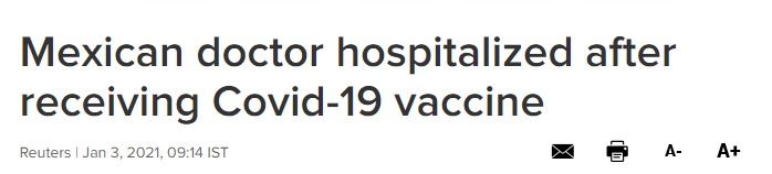 据多家外媒报道,墨西哥一名醫生接種美國輝瑞和德國BioNTech共同研發的新冠疫苗後出現腦脊髓炎,被送往當地一家公立醫院的重症監護室。這位醫生的名字尚未公布。