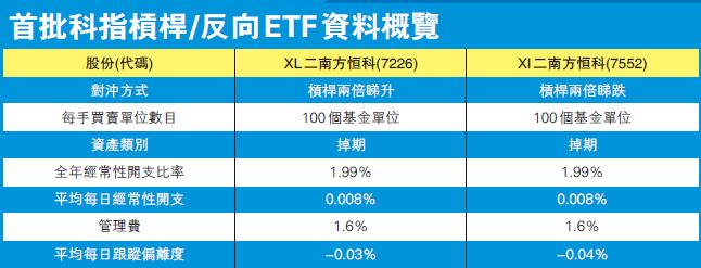 南方東英去年底推出了兩隻追蹤恒生科技指數的槓桿正向及反向ETF,分別是科指槓桿兩倍睇升的XL二南方恒科(7226),以及科指反向兩倍睇跌的XI二南方恒科(7552)。顧名思義,前者是看漲時買入,理論上科指升1%,產品價格升2%;後者則是看淡時買入,理論上科指跌1%,產品價格升2%。
