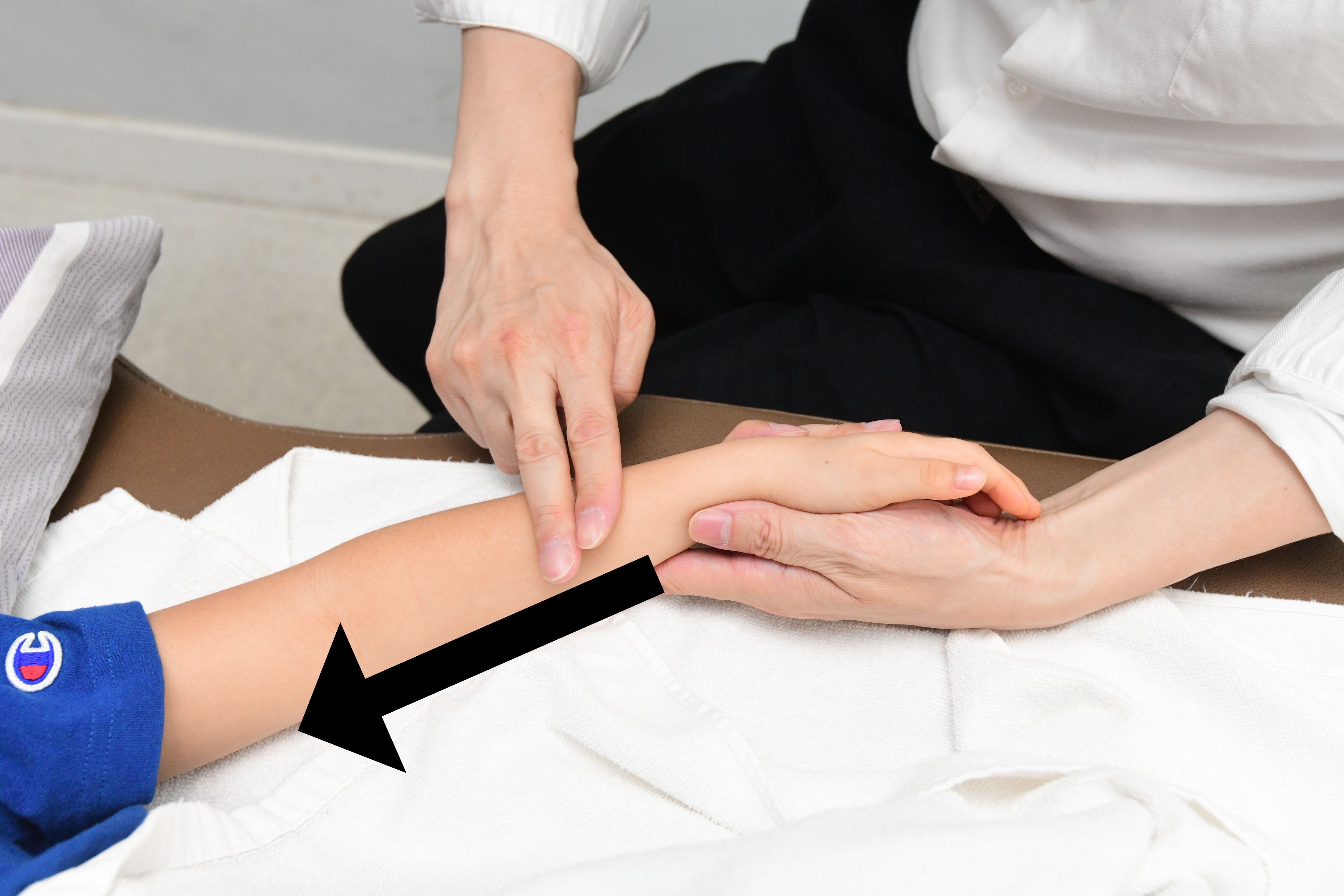 推三關穴可促進消化、增加血液循環,整支臂向關節處推。