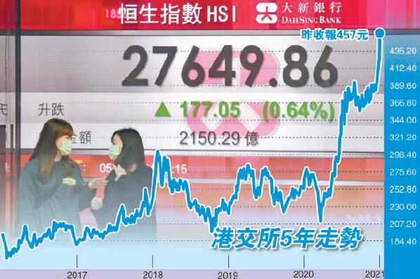 港股連升5個交易日,恒指昨收報27649.86點升0.64%,創逾10個月新高。值得一提的是,新股市場氣氛十分活躍,多隻股份錄得數百倍超額認購。鬧猛氛圍下,港交所(388)股價連日來屢創新高,昨創下460元高點,收市至457元,較前一交易日升3.44%。