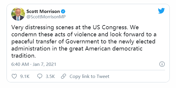 美國國會當地時間6日發生騷亂後,莫里森在推特上稱,美國國會出現了非常令人痛心的一幕,並譴責這些暴力行為,希望美國政府權力能和平過渡。