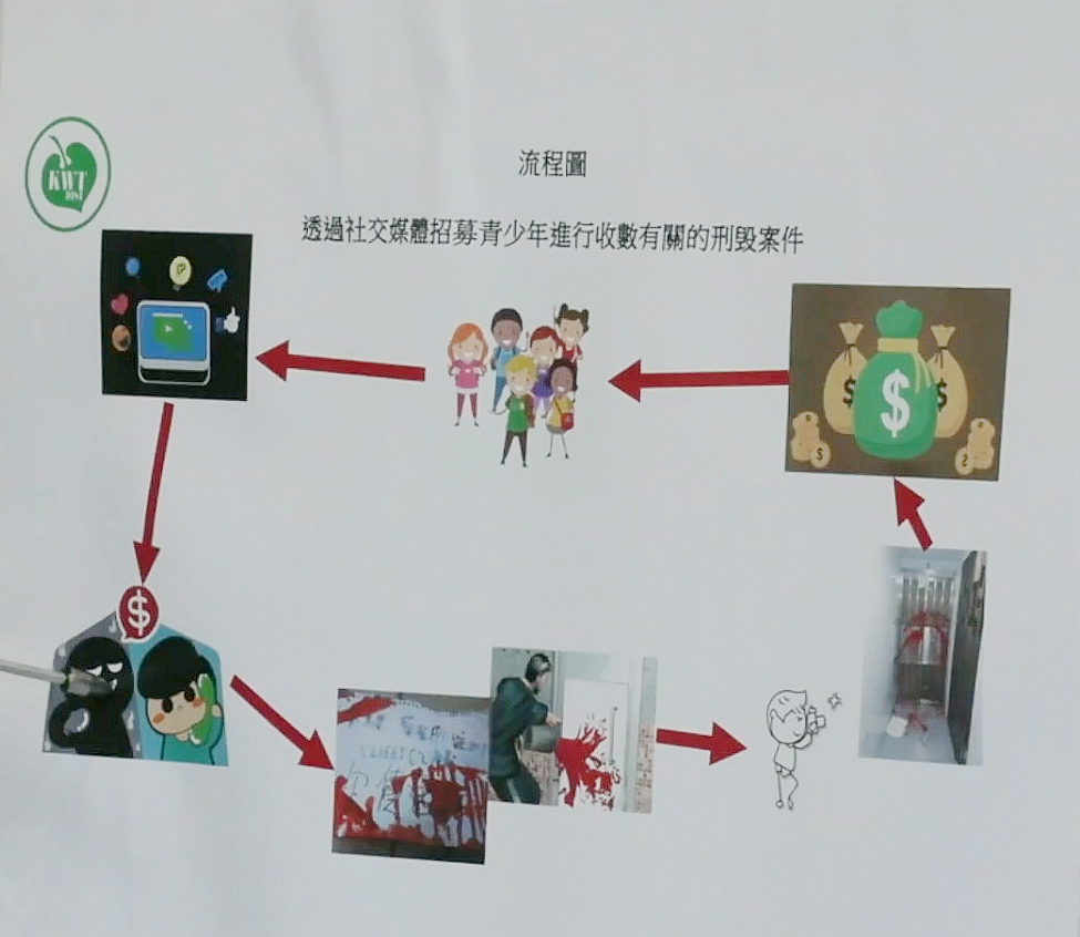 林志源說,相信涉案年青人是透過社交媒體中一些不公開的群組,得悉有「搵快錢」工作,不法分子透過媒體招募青少年替其淋紅油、貼追數信和塞匙孔等,青少年收到「柯打」後會將工具放進背囊,到達目標單位後落手犯案,再用手機拍下相片傳給「上線」,即可收取現金作報酬。他形容青少年尤其是學生,相信該類「搵快錢」工作十分「簡單」,每單一「工作」報酬分別由數十元至數百元,或以每日工作量計算。