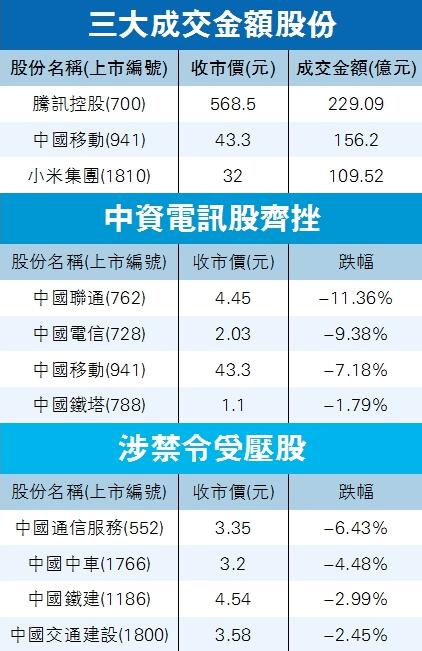 聯通(762)插11.4%,為表現最差藍籌;中移動(941)插7.2%;中電信(728)插9.4%。其他「禁令股」亦受壓,中車(1766)跌4.5%,中交建(1800)跌2.5%,中鐵建(1186)跌3%,惟中芯(981)再升2.7%。