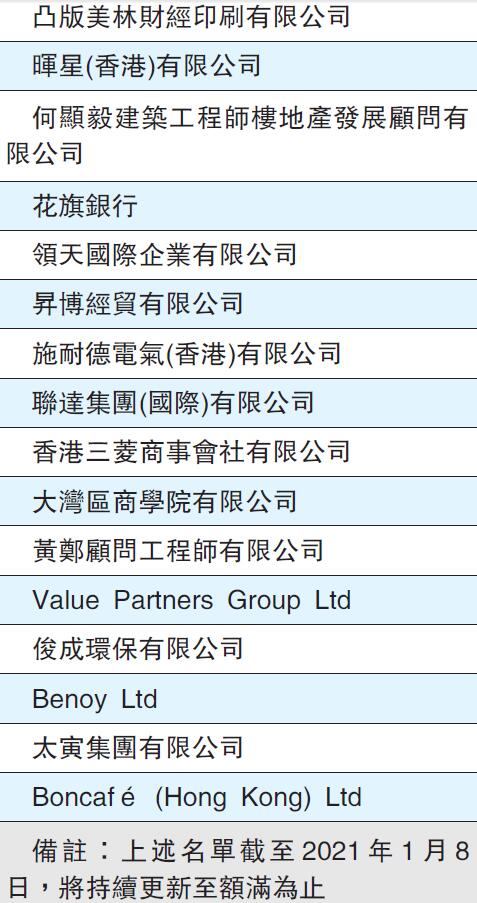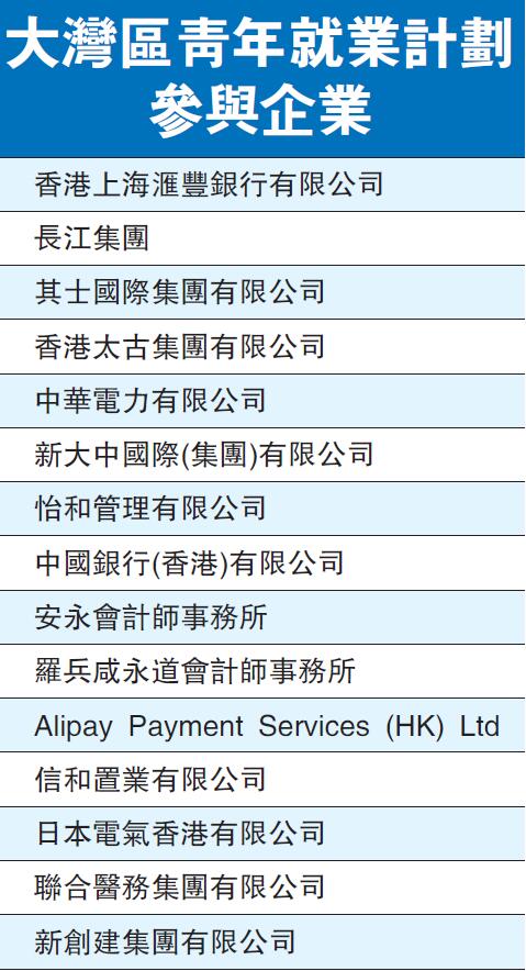 特區政府昨日正式推出「大灣區青年就業計劃」,鼓勵在香港及粵港澳大灣區有業務的企業,聘請及派駐香港青年人到大灣區內地城市工作,名額2000個,當中約700個專為創科職位而設。本港多間企業均積極響應參與有關計劃,至今確定參與計劃的包括汇豐銀行、長江集團、其士國際、太古集團、中華電力、中銀香港、信和置業及新創建集團等,名單將不斷更新,相關企業將提供不同職位,並協助本港大學畢業生到大灣區生活及就業。