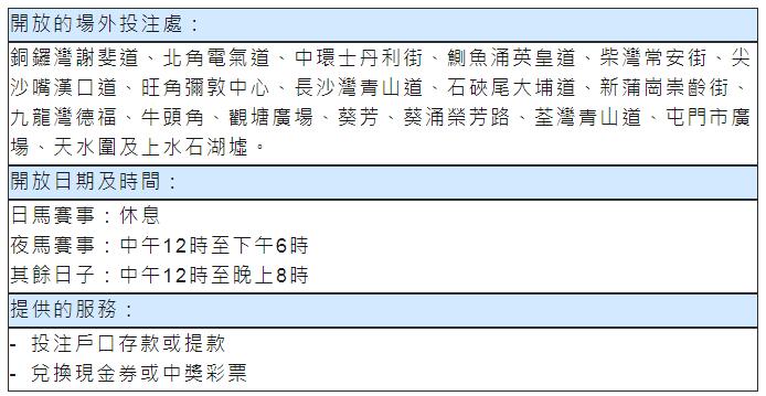 因應新冠肺炎疫情,馬會由去年12月15日起,開放3間場外投注站;鑑於農曆新年將至,為滿足顧客需求及疏導人流,馬會宣布,由今日(8日)起,開放19間場外投注站,提供投注戶口提存及兌換現金券或中獎彩票的服務,但不會提供投注、開設及重啟投注戶口的服務。