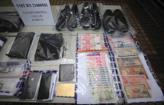楊新邦呼籲,案中檢獲的證物包括4個女裝名牌手袋、2隻手表、金器和一批衣服,呼籲市民如是失物的物主可致電36619341與油尖刑事調查隊第10對探員聯絡。(記者區天海)