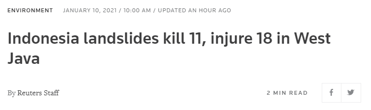 據路透社消息,印尼國家災難管理委員會(BNPB)當地時間10日表示,印尼西部大雨造成的山體滑坡造成11人死亡和18人受傷。