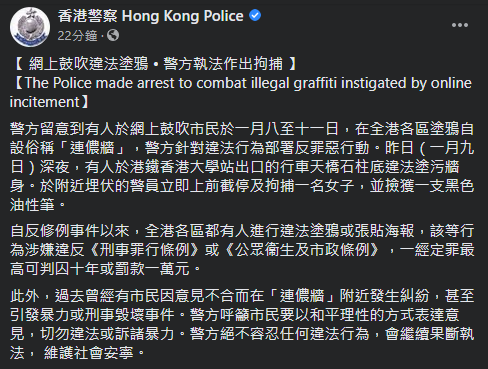 警方在社交平台表示,留意到有人在網上鼓吹市民於1月8至11日,於全港各區塗鴉自設「連儂牆」,而昨日(9日)深夜,有人於香港大學站出口的行車天橋石柱底違法塗污牆身,在附近埋伏的警員立即上前截停及拘捕1名女子,並撿獲一支黑色油性筆。