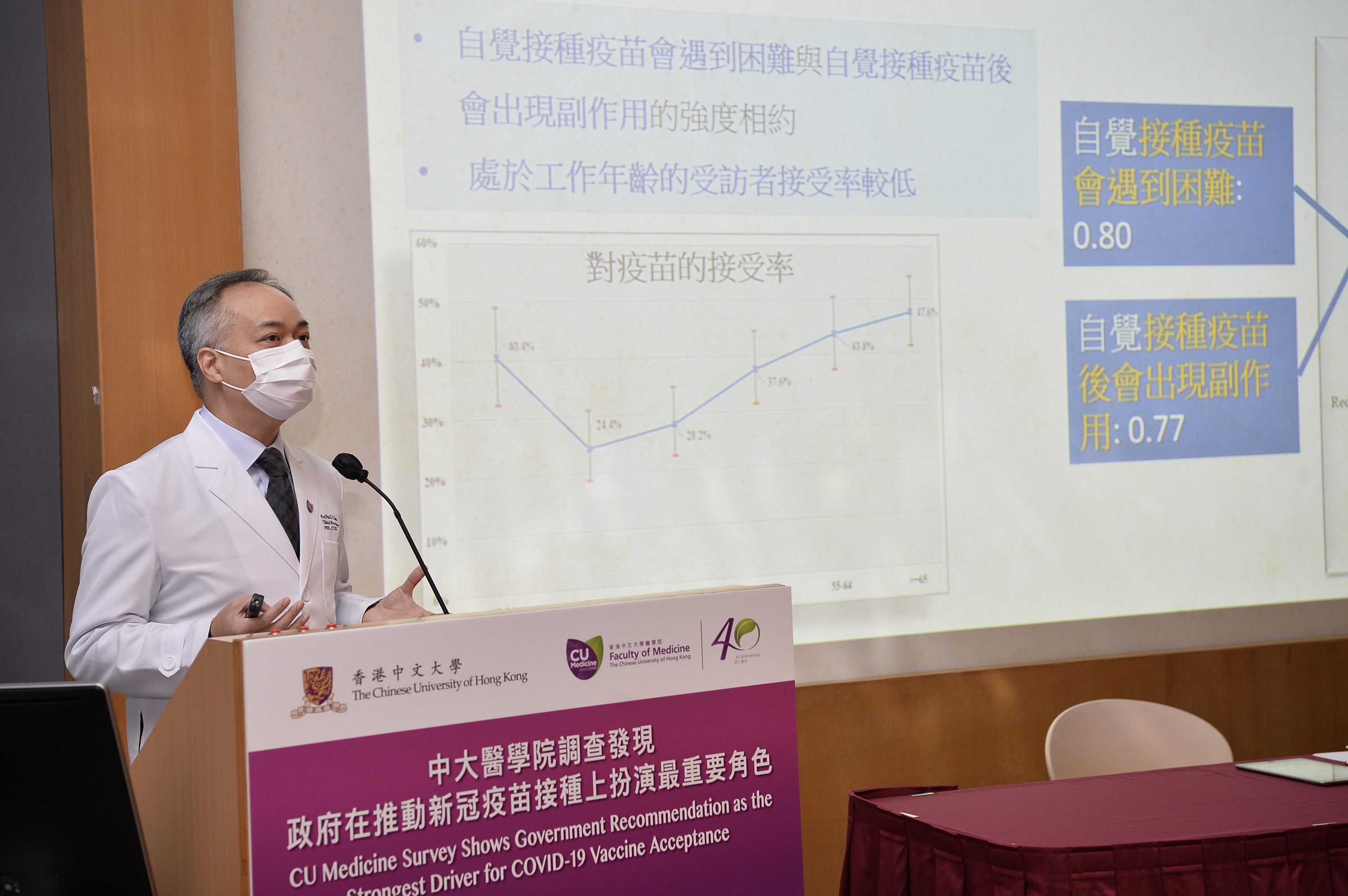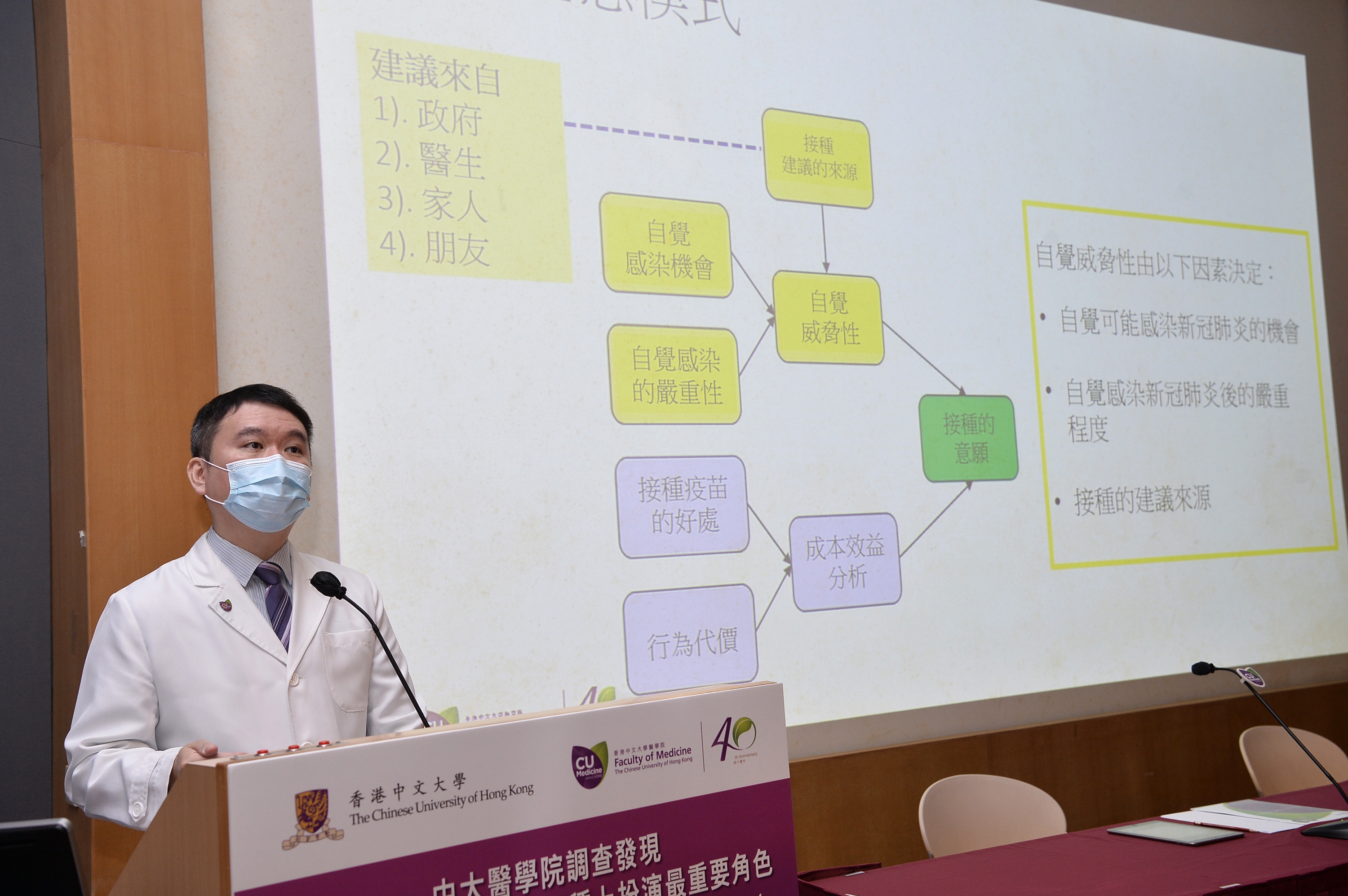 中大醫學院賽馬會公共衞生與基層醫療學院黃至生教授強調,調查亦發現感染新冠肺炎的自覺風險與是否願意接種疫苗,兩者之間沒有關係。 「受訪者或會認為除非身體有長期病患等潛在健康風險,否則患上新冠肺炎只是輕症。此發現指出對較年輕和健康的人士須設計不同的推廣和教育計劃,採用『健康信念模式』及考慮提供適當的誘因確保達到接種目標。」(記者 葉珮如)