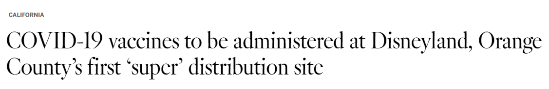 報道引援縣政府的監管人員消息稱,迪斯尼樂園將是五個大型的「分發點」之一,這些分發點每天可以為成千上萬的居民接種疫苗。聲明說,其他地點的安排正在最後確定。