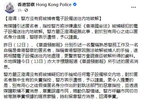 有媒體引述匿名者,指控警方將涉嫌違反《香港國安法》被捕疑犯的電子設備送往內地破解。警方今日(13日)嚴正澄清絕無此事,對於別有用心之徒以匿名身份造謠,警隊表示遺憾,予以譴責。
