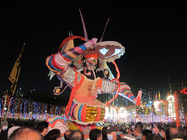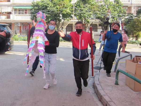 同日晚上大士人巡圍掀醮會高潮,村民爭相拍照,但中途大士人腰背「不適」,經修理後堅持完成巡圍,如彭宏健說「面對前方未知的困難,也能輕鬆應對」。回到醮場,大家排長隊「捐」過被抬高的大士人胯下,希望新一年身體健康,疫情消失。(香港商報特約記者 梁美儀)