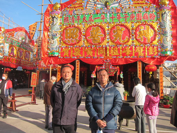 粉嶺圍醮務委員會主席彭慶培(右)和副主席彭宏健表示,醮會在疫情下能順利進行,有賴村民熱心參與,分工合作。特約記者梁美儀攝
