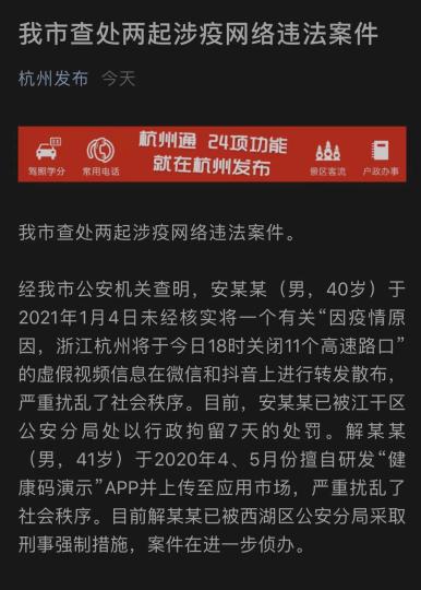 公告還通報了另一起涉疫網絡違法案件,安某某(男,40歲)於2021年1月4日未經核實將一個有關「因疫情原因,浙江杭州將於今日18時關閉11個高速路口」的虛假視頻信息在微信和抖音上進行轉發散布,嚴重擾亂了社會秩序。目前,安某某已被杭州市公安局江干區公安分局處以行政拘留7天的處罰。
