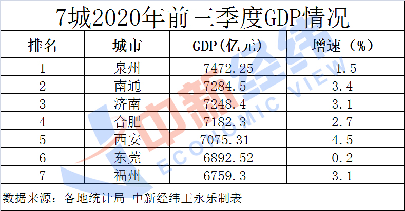 在上述7城中,東莞2019年GDP位列第二,與1萬億元相差約500億元。2020年前三季度排名位列第六。