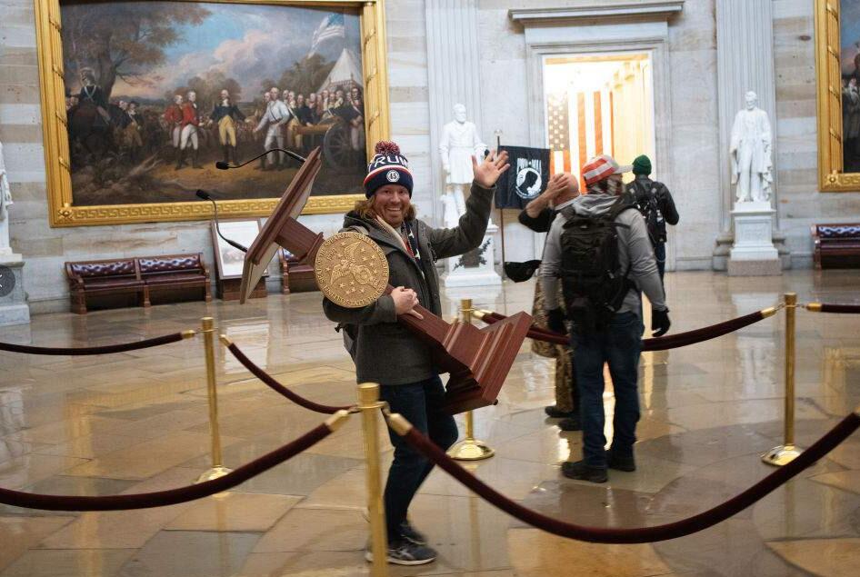 佛州男子、36歲的約翰遜在這起事件中被控盜竊政府財產、進入受限制的建築物並在國會大廈內擾亂秩序。約翰遜面帶微笑,胳膊下夾著這個木製講台在國會大廳亂逛的照片迅速成為當天最具象徵性的照片之一。