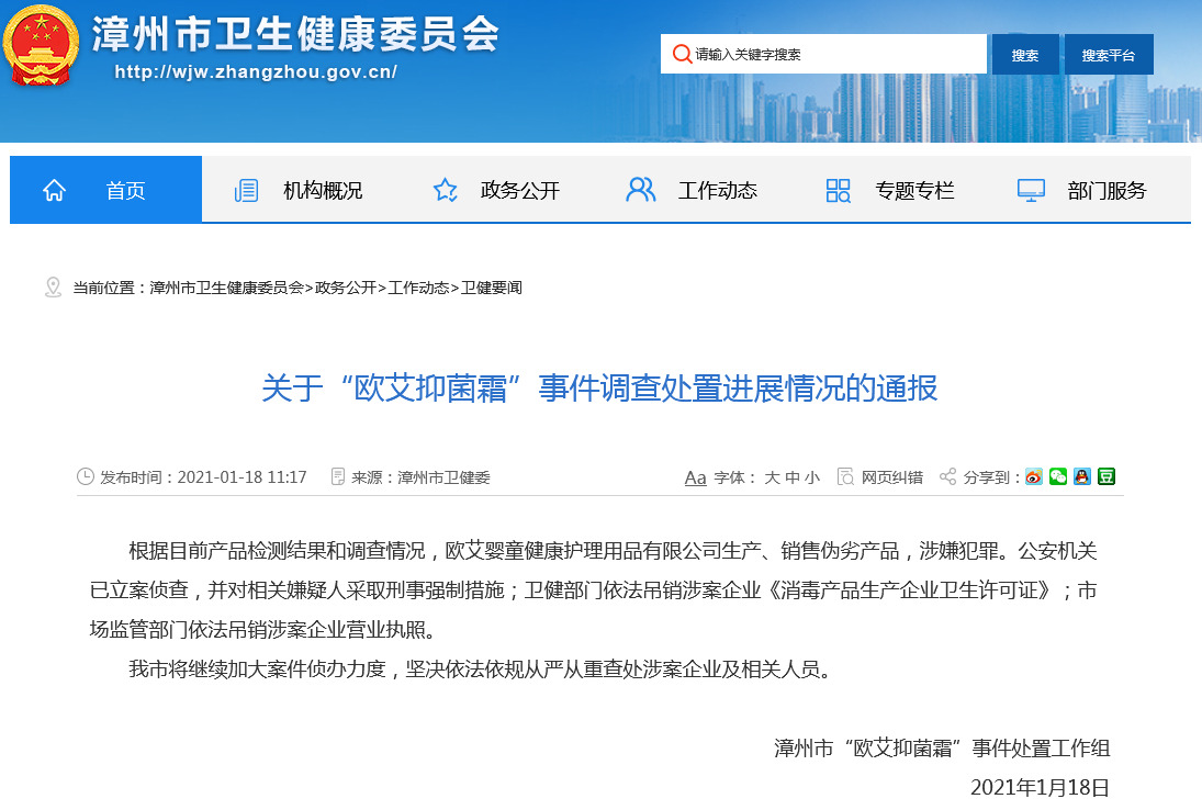 18日,福建漳州市衛健委網站發布關於「歐艾抑菌霜」事件調查處置進展情況的最新通報:根據目前產品檢測結果和調查情況,歐艾嬰童健康護理用品有限公司生產、銷售偽劣產品,涉嫌犯罪。公安機關已立案偵查,並對相關嫌疑人採取刑事強制措施;衛健部門依法吊銷涉案企業《消毒產品生產企業衛生許可證》;市場監管部門依法吊銷涉案企業營業執照。漳州市將繼續加大案件偵辦力度,堅決依法依規從嚴從重查處涉案企業及相關人員。