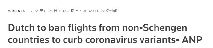 據路透社消息,荷蘭將從1月23日起禁止來自非神根國家的航班,以遏制變種新冠病毒傳播。