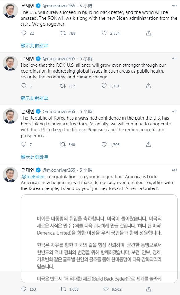 文在寅同時在推特上以英文寫道「美國回來了」(America is back)。他表示,美國新的開始將使民主主義更加偉大,韓國民眾也將支持「美國團結」(America United)。相信衛生、安全、經濟、氣候變化等全球性問題合作會加固韓美同盟。