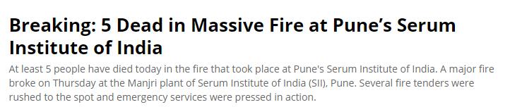 據今日印度 (India Today)消息,火災發生於當天14時45分,印度血清研究所一處在建建築的兩層樓內起火。報道指印度血清研究所被稱作世界上最大的疫苗生產商,它正在製造由牛津大學和阿斯利康公司開發的新冠疫苗,火災不會影響其新冠疫苗的生產活動。