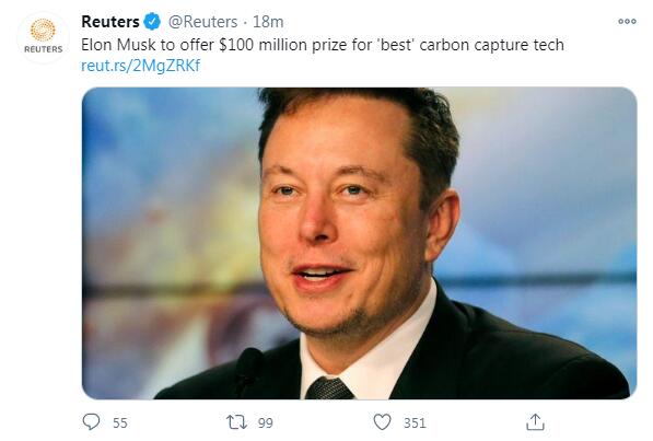 馬斯克在推特上寫道:「我將捐贈1億美元,以獲得最佳碳捕捉技術。」他隨後又發了一條推特,承諾將在下周公布細節。
